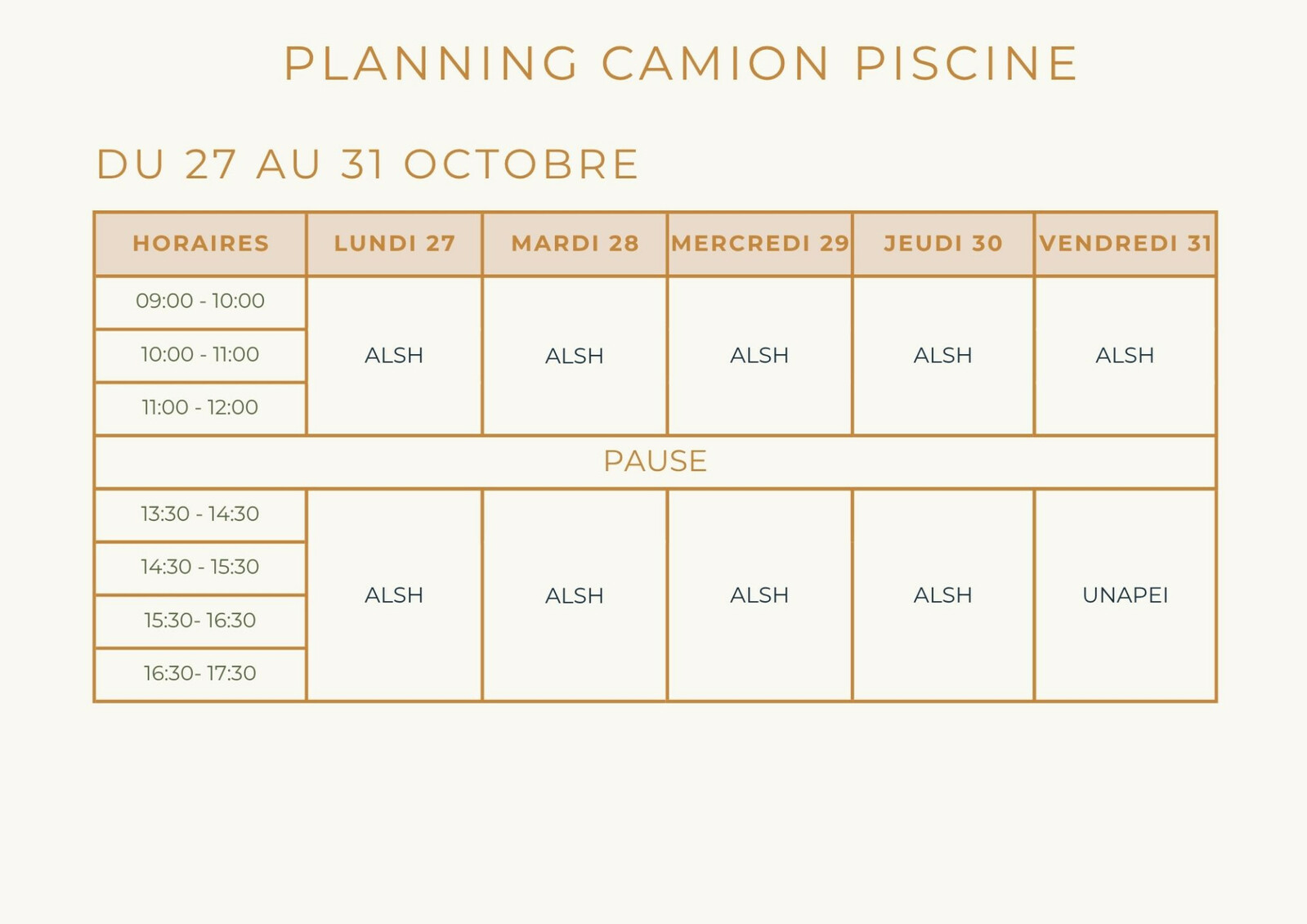 - Bébés nageurs (0 à 3 ans + un parent dans le bassin) : jeudi 23 octobre de 9h à 12h
